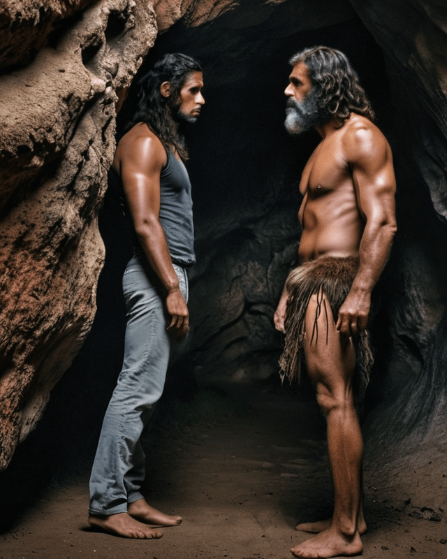 • Watercolor illustration of a muscular, spear-wielding caveman in a desert landscape, overlooking the remains of an ancient star ship buried in sand dunes beneath alien mountains.